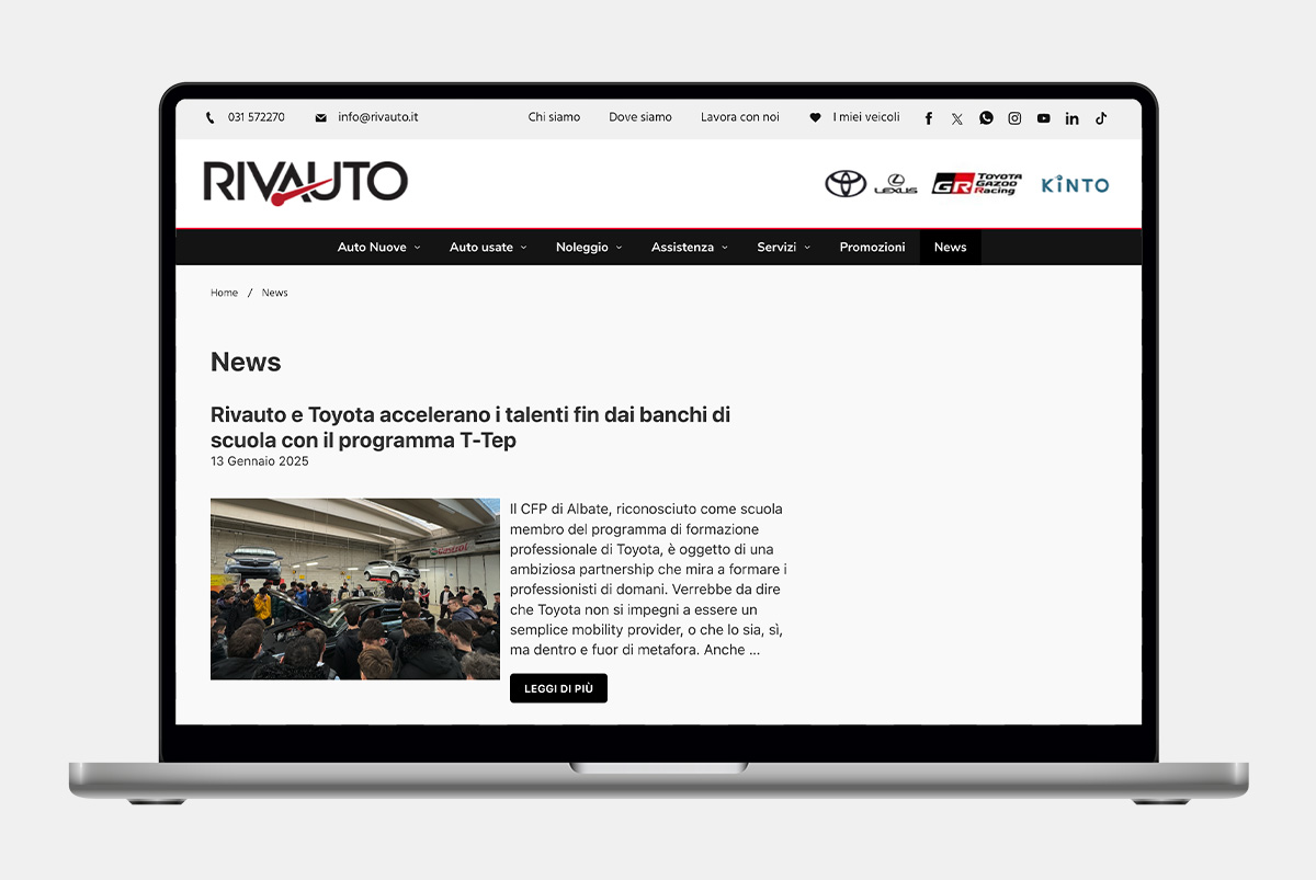 Quando MEKKO e Rivauto si sono raffrontati hanno delineato una strategia di comunicazione chiara: arrivare dove Toyota Italia – nella sua brillante attività per il mercato nazionale – non può giungere. Ovvero, dietro le quinte di un’impresa e di un team affiatatissimo, di iniziative rivolte alla community, di eventi sportivi, culturali e benefici a cui il cliente partecipa da protagonista. Un’attività di comunicazione organica che procede sui canali social di Meta e Linkedin da fine 2022 (cui si è aggiunto, a inizio 2024, TikTok) e sul blog, atta a generare brand awareness e a consolidare una community digitale arrivata a quasi 10.000 utenti, costruita attorno a un'insegna molto nota e apprezzata sul territorio lariano.