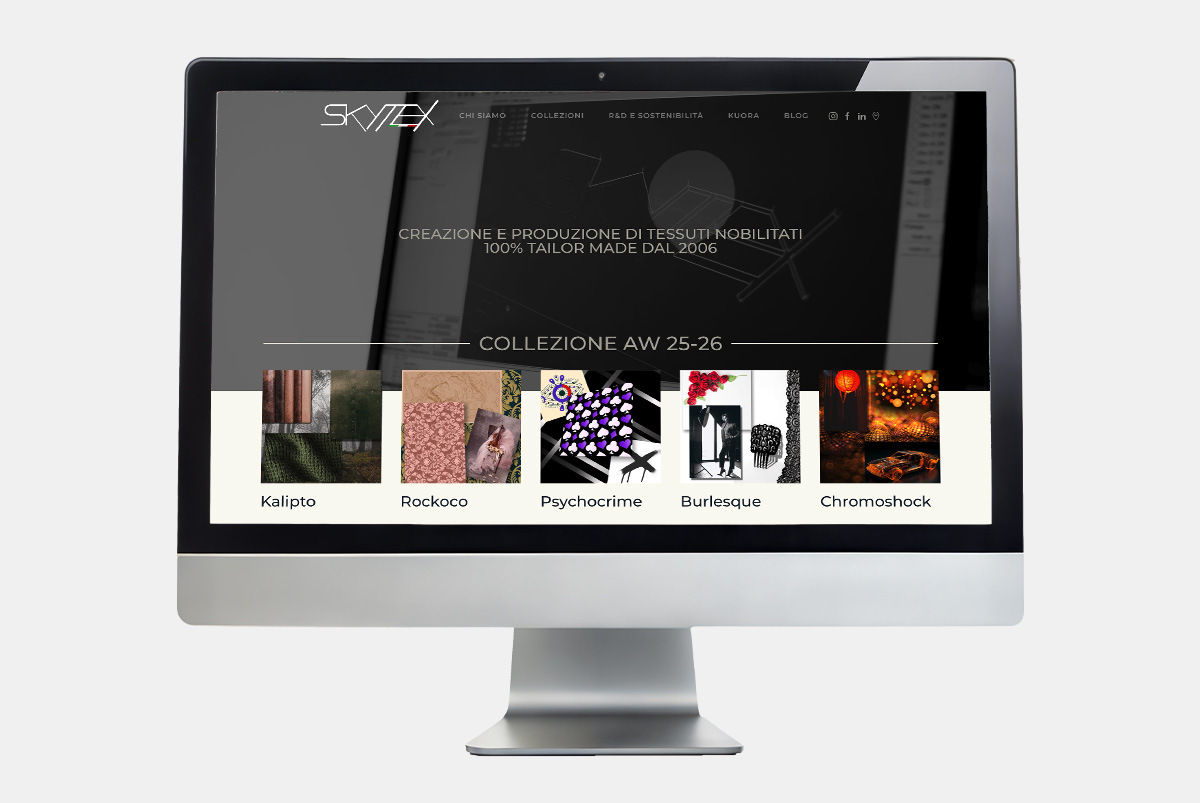 Il sito ufficiale ha vissuto un radicale ripensamento estetico nel segno di una user experience articolata ma intuitiva. In costante allineamento con i decision maker aziendali, MEKKO ha quindi contribuito a implementare una grande novità: le collezioni. Assortimenti periodici basati su suggestioni e tendenze, raccolti secondo temi stilistici di rilievo. Un’innovazione nel marketing mix alla voce “Prodotto” che ausilia la rete commerciale e ha visto lo sviluppo di un’apposita sezione sul sito. In parallelo, è stato creato un blog corporate aggiornato mensilmente con news, approfondimenti e statement identitari per ribadire il posizionamento di SkyTex. Sempre nell’ottica di dotare i sales di strumenti in grado di fare la differenza è stata anche elaborata una presentazione corporate pensata appositamente per le contrattazioni commerciali, che oggi costituisce un asset di grande supporto per gli addetti alle vendite.